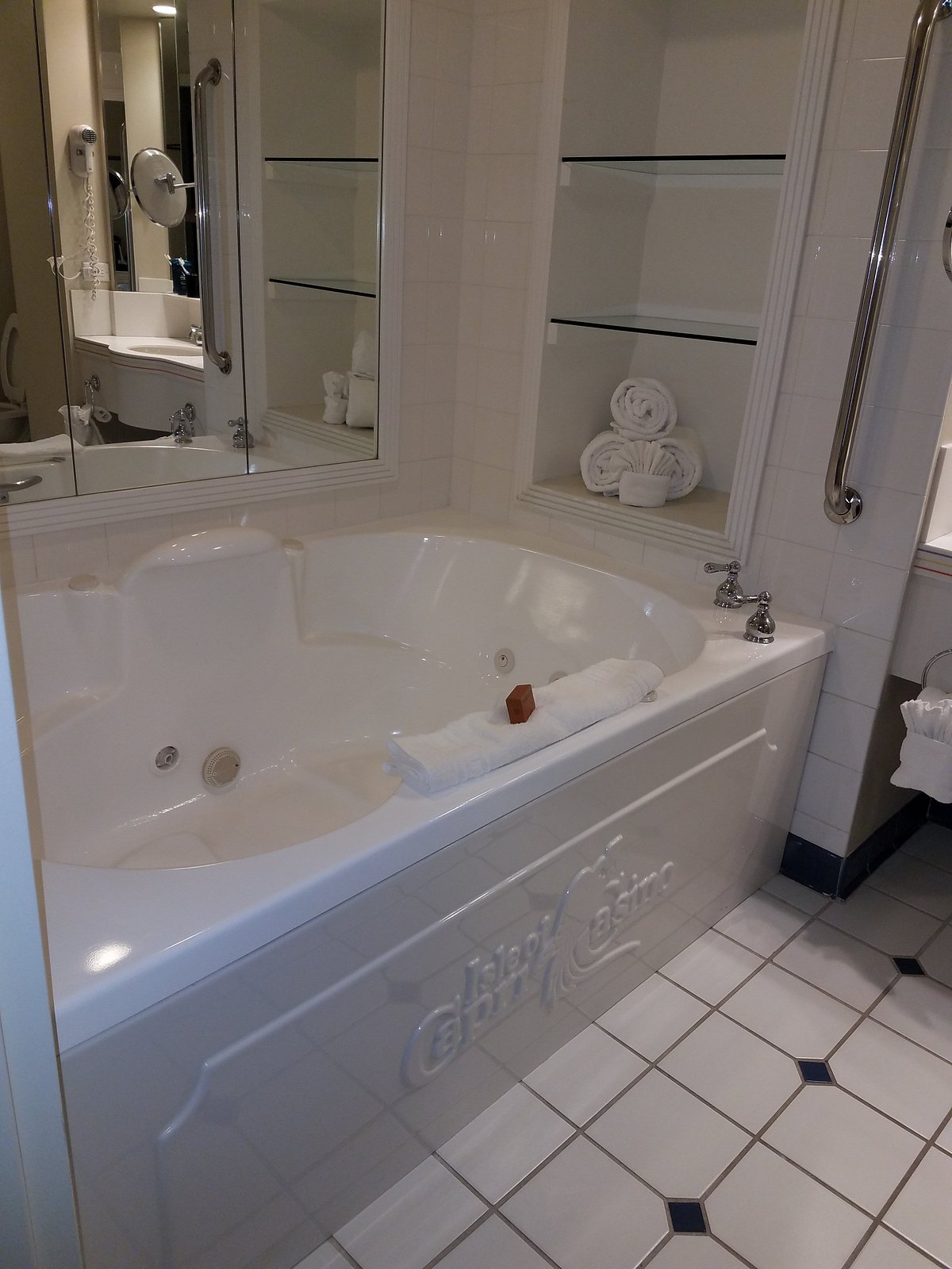 The cons: The drink service in the casino was disappointing. It was my birthday, and in the many many hours we gambled over 2 nights, with money constantly in the machines, we were only approached by a cocktail waitress one time for a single drink each. We tipped well, but didn’t see another waitress the whole night. They also wouldn’t let us use a luggage cart to bring our own luggage up. They kept insisting to use the bell hop. So we had to carry our heavy stuff from the garage to our room, which was a pretty long walk. Lastly, I would’ve loved to have a microwave in the room.