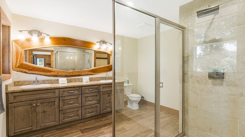 Contemporary log cabin featuring a smart TV, walk-in shower, and an outdoor jacuzzi, close to North Carolina Arboretum.