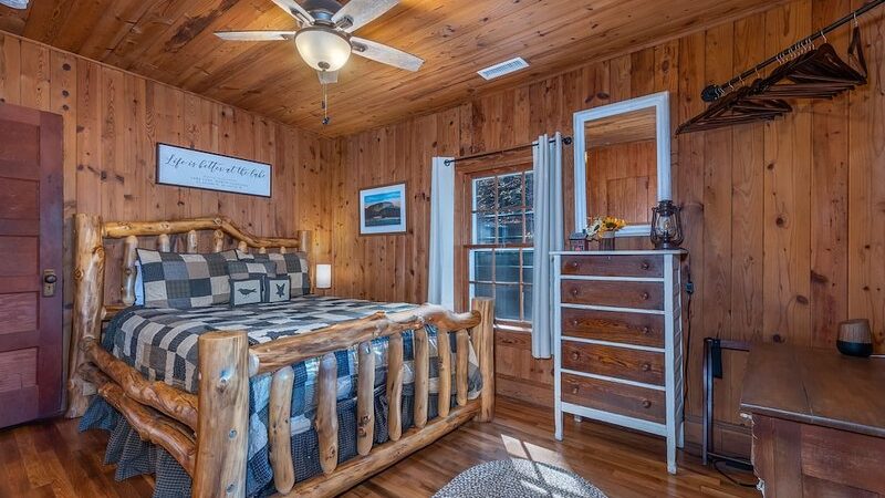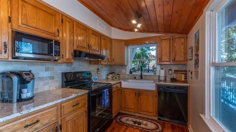 Charming lodge-style cabin with hardwood floors, a complete kitchen, and a scenic outdoor jacuzzi, near Biltmore Estate.