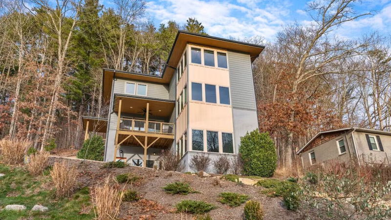 Chic mountain retreat featuring a deck, cozy fireplace, and a relaxing outdoor jacuzzi, close to Asheville’s River Arts District.
