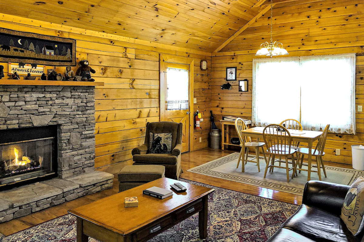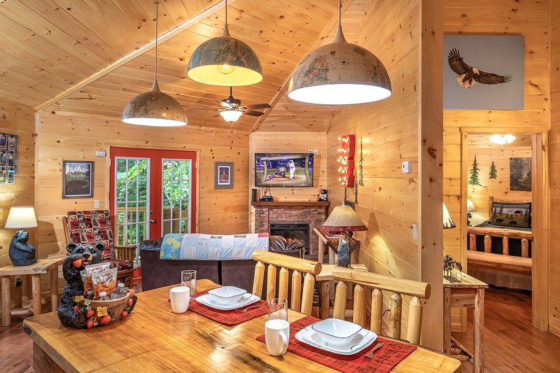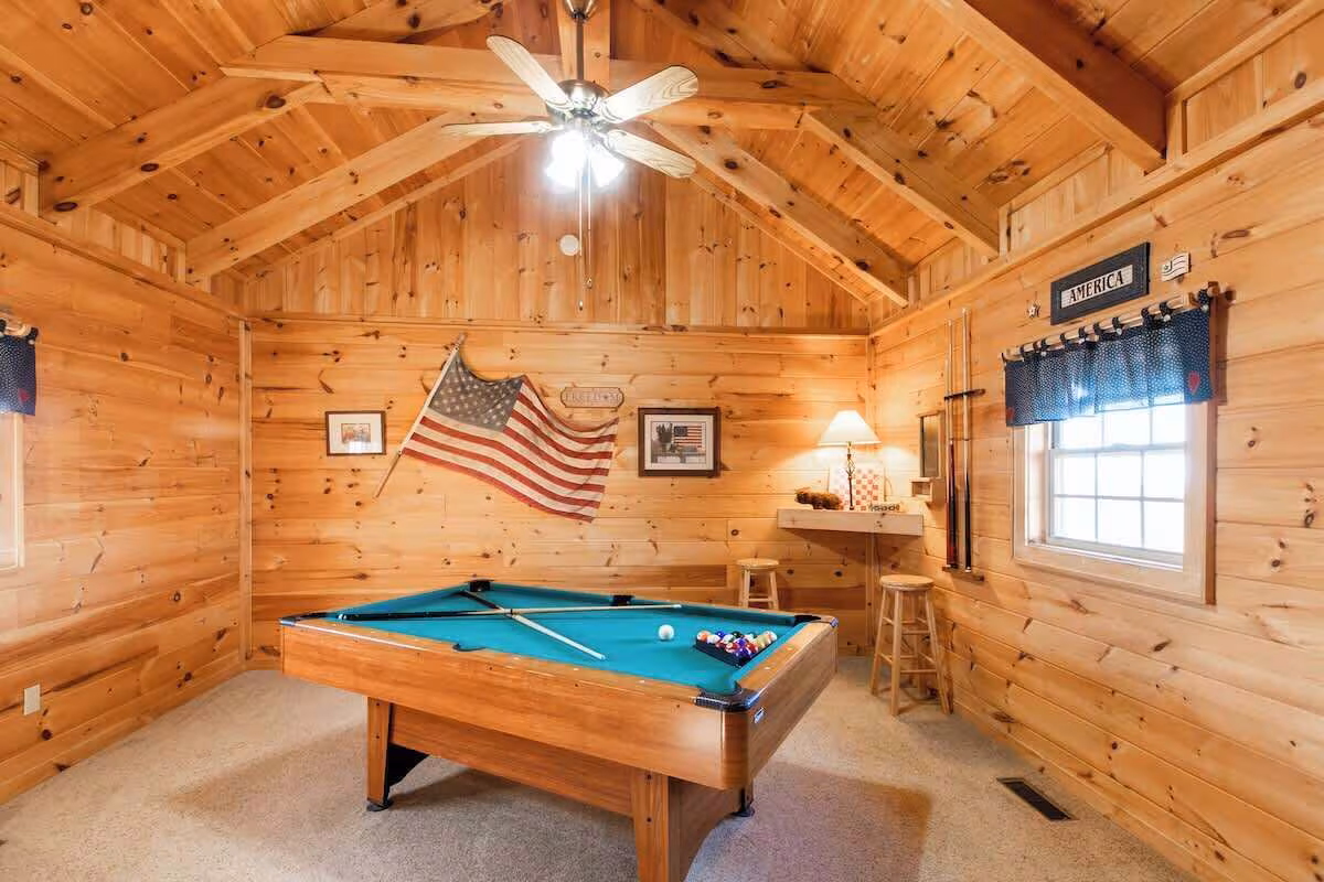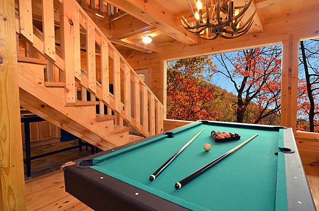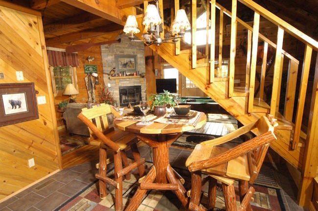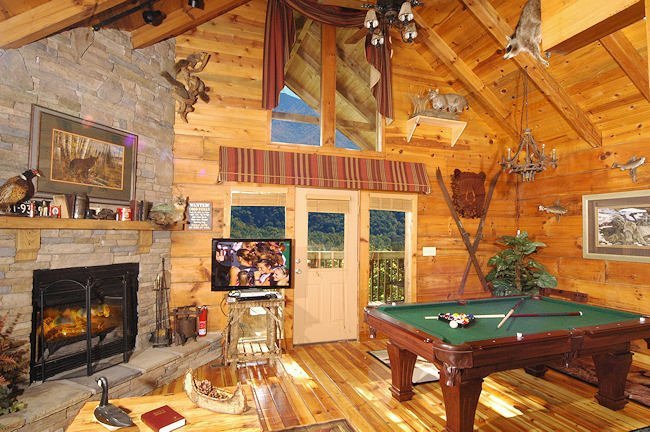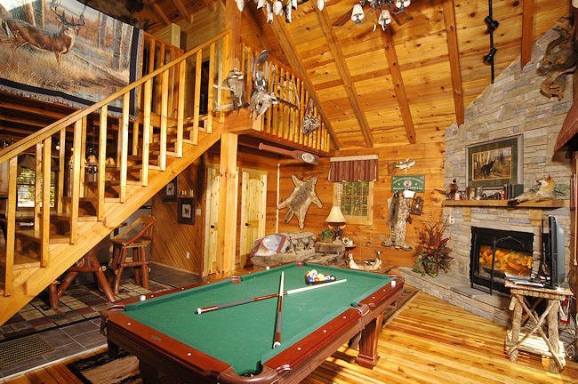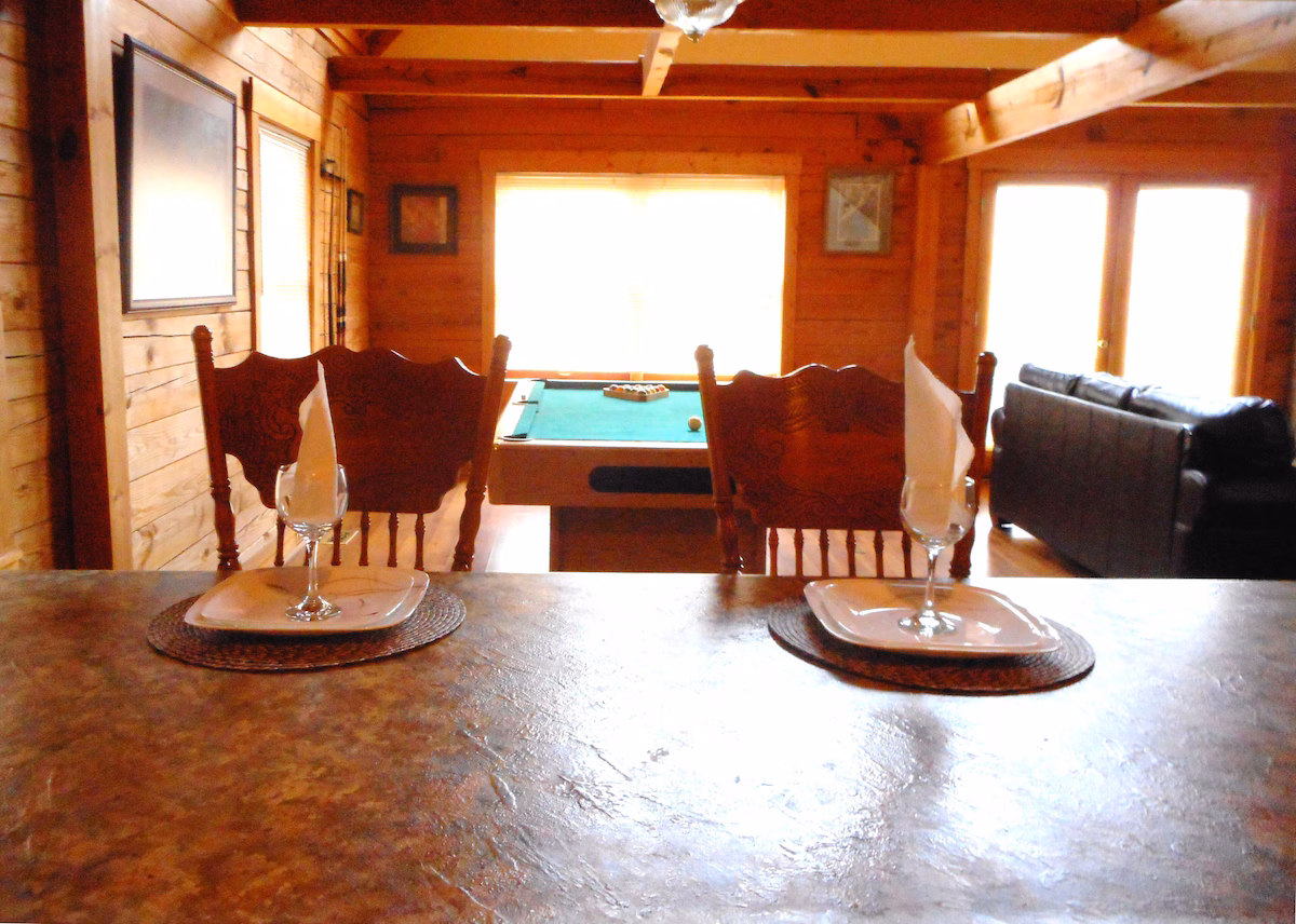 Peaceful cabin featuring a jacuzzi, pool table, fireplace, and kitchen near downtown Gatlinburg.