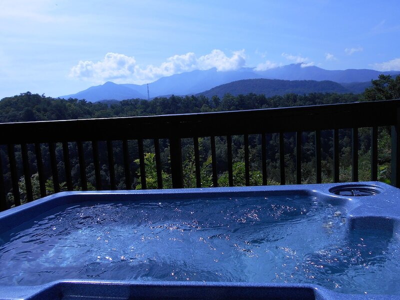 Stylish cabin featuring a jacuzzi on the deck, pool access, a kitchen, and stunning Smoky Mountain views.