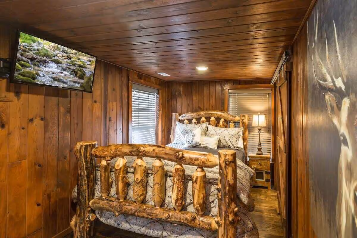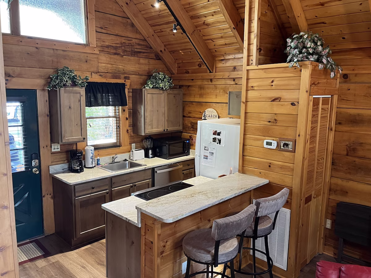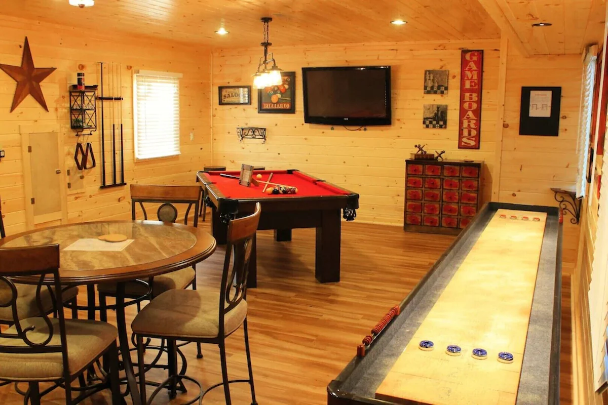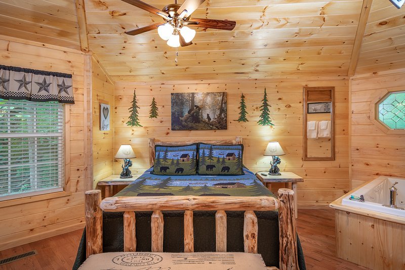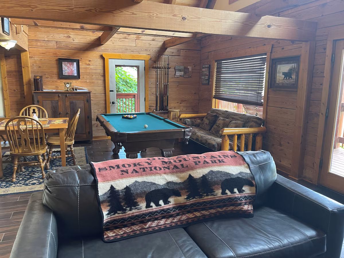Escape to a rustic alpine retreat featuring a jacuzzi, pool table, kitchen, and king bed, near downtown Gatlinburg.