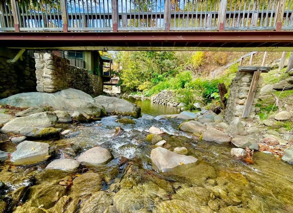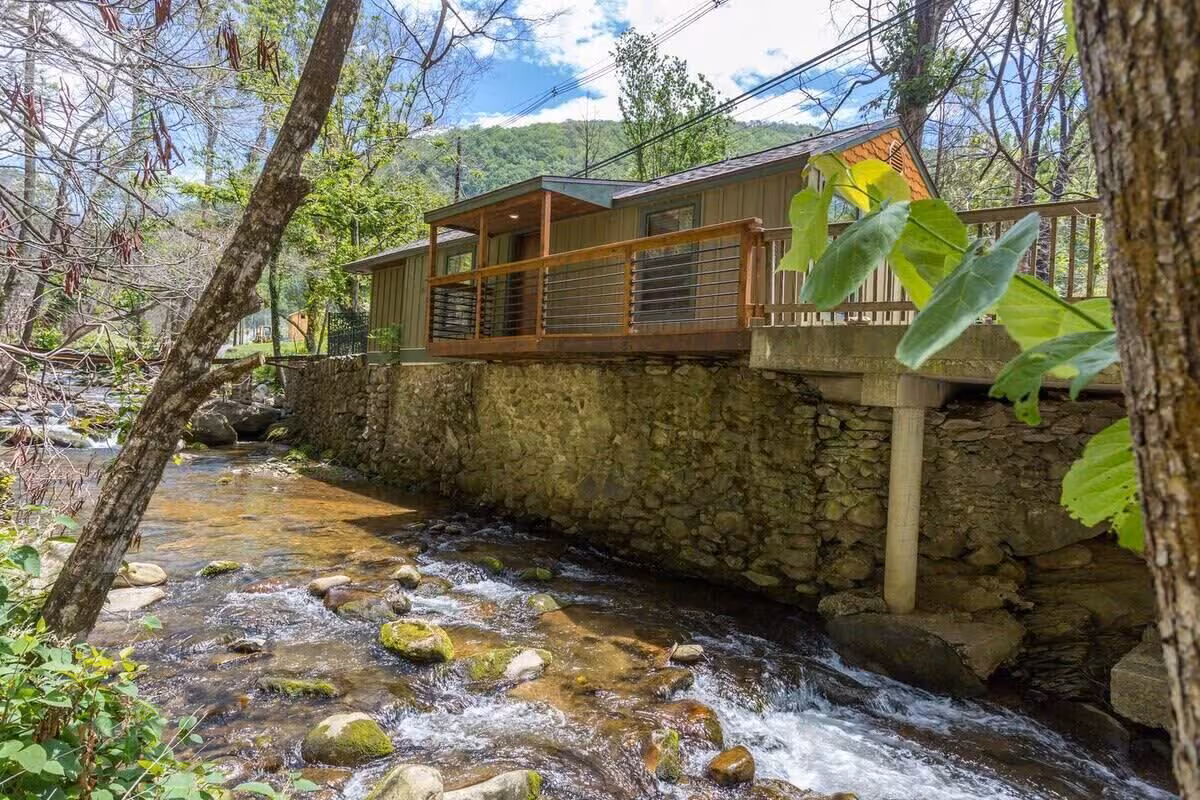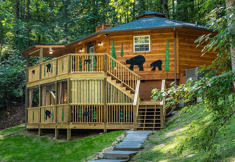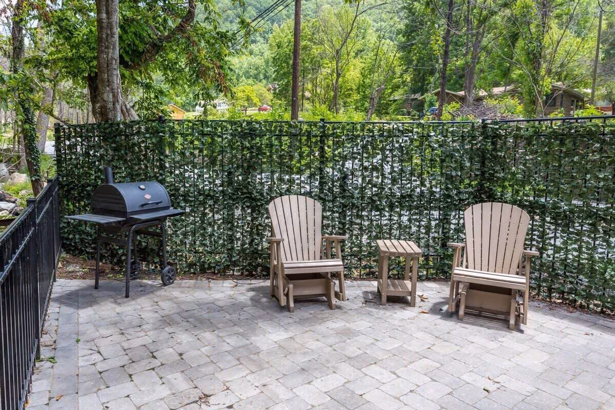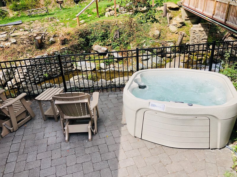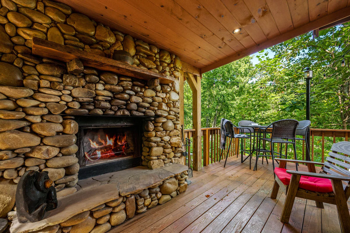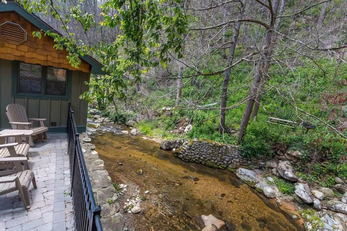 Cozy one-bedroom cabin featuring a jacuzzi, stone patio, and stream access by Great Smoky Mountains.