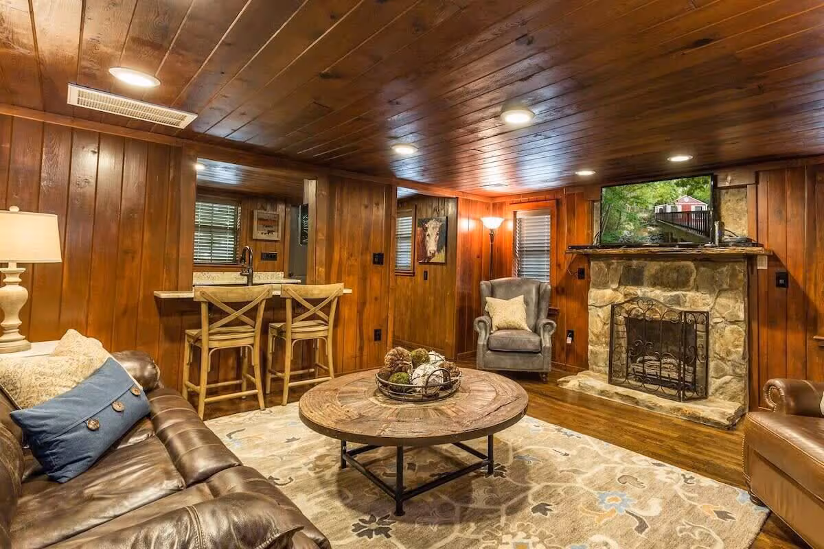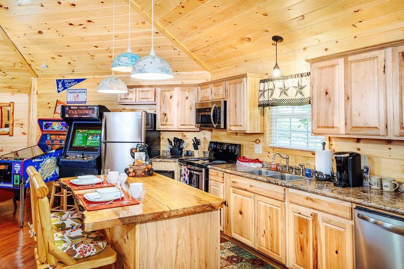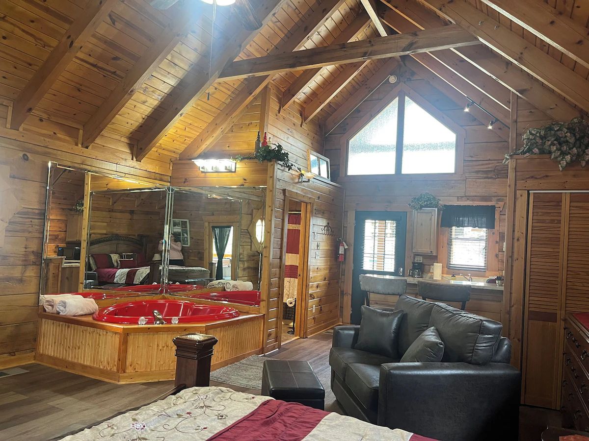 Large cabin featuring a jacuzzi, stone fireplace, and kitchen, just 2.3 miles from Ripley’s Aquarium.
