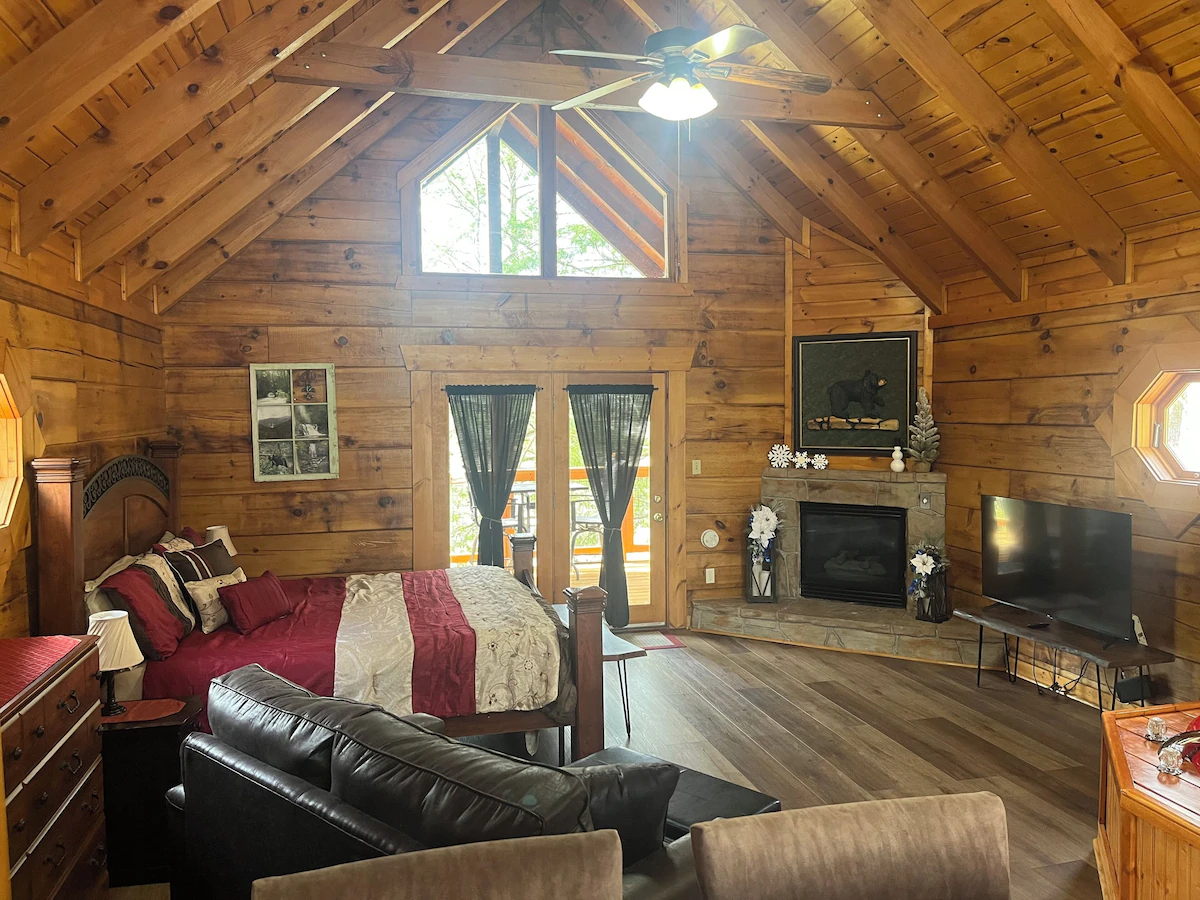 Enjoy a romantic getaway featuring a kitchen, cozy wood-burning fireplace, and a large hot tub, just ten minutes from Main St Gatlinburg.