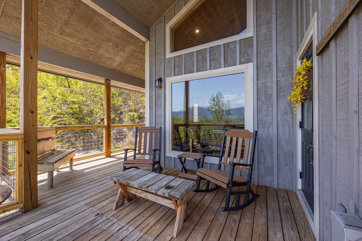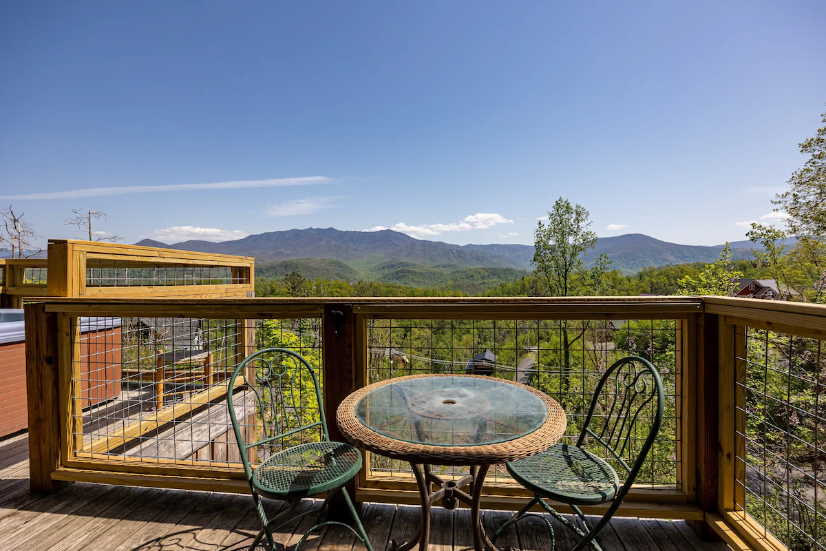 Enchanting Gatlinburg cabin featuring a jacuzzi, fire pit, and a scenic wrap-around porch with Mt. LeConte vistas.