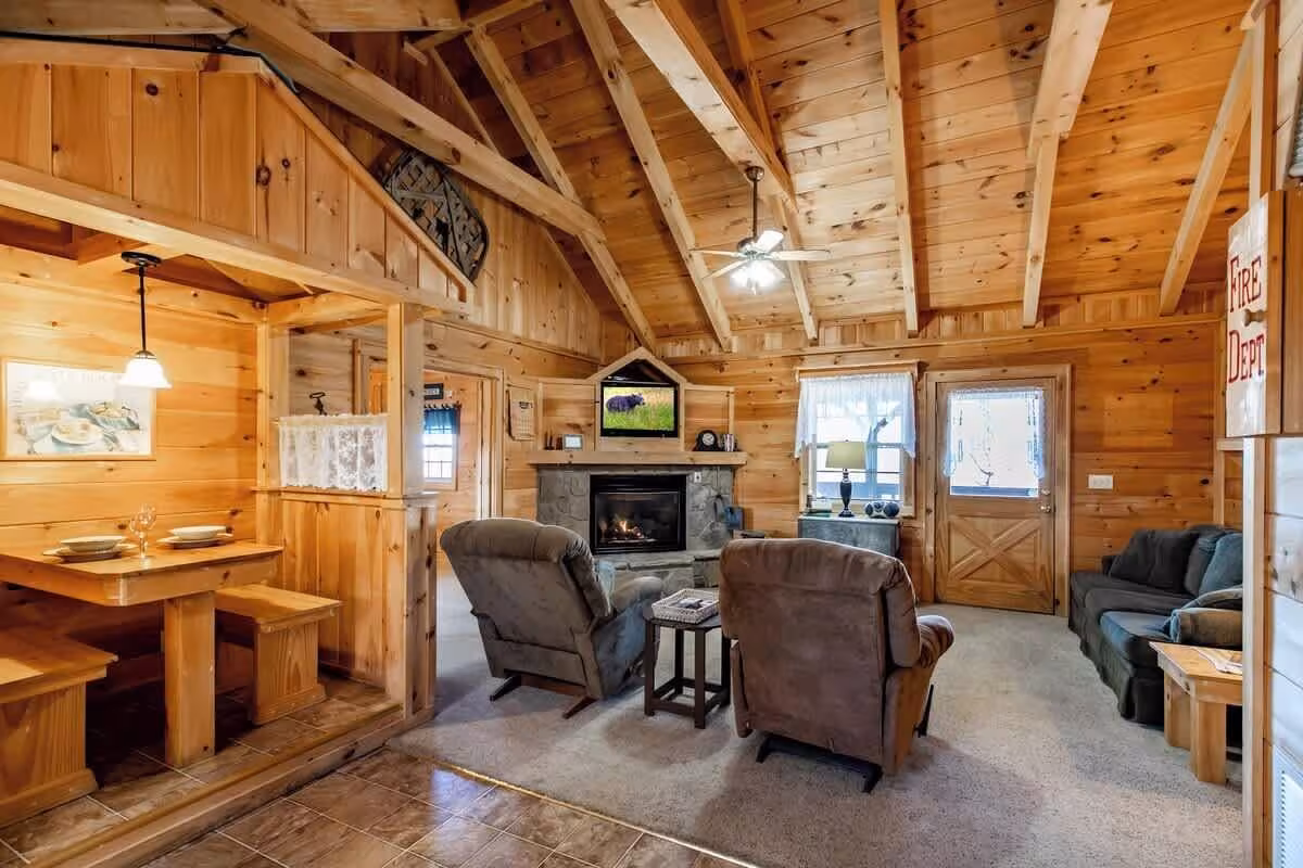 Log cabin featuring a jacuzzi, a stone hearth, and a complete kitchen, just 4.9 miles from Dollywood.