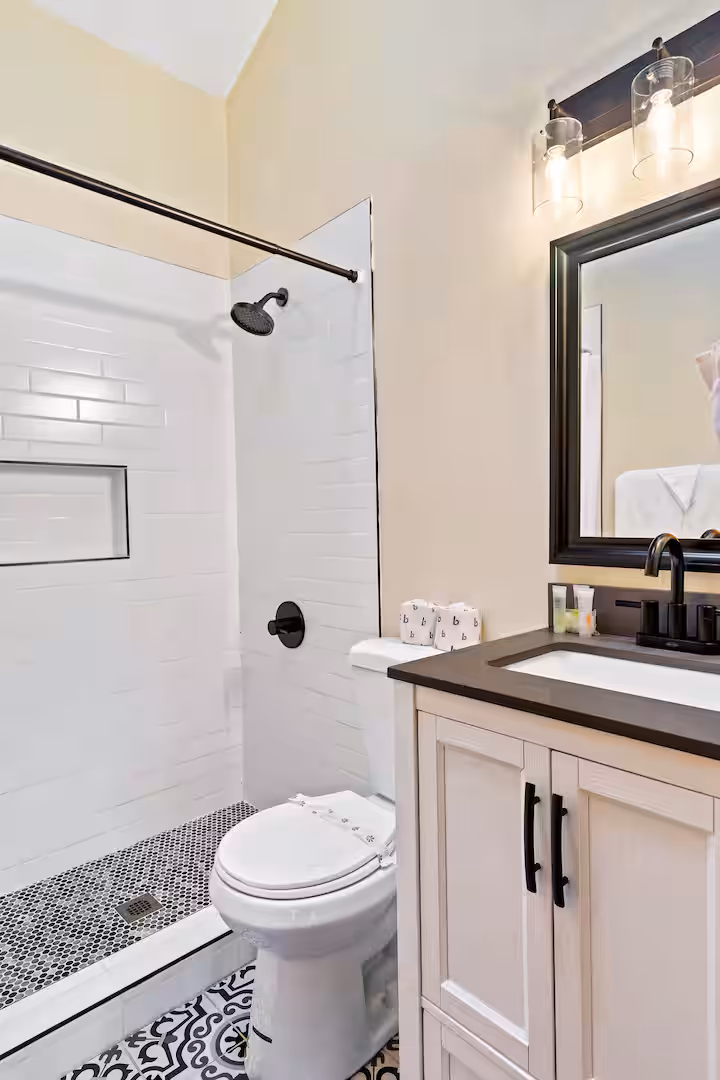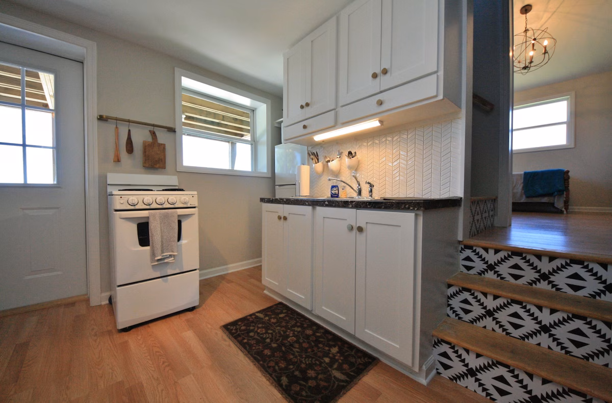 This stay features a welcoming front porch, a private jacuzzi, a complete kitchen, and a king bed master suite.