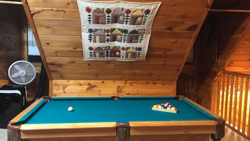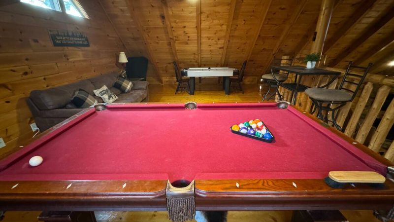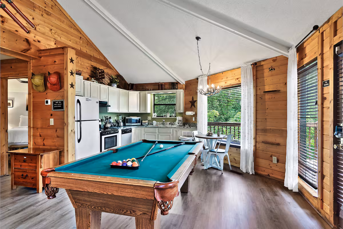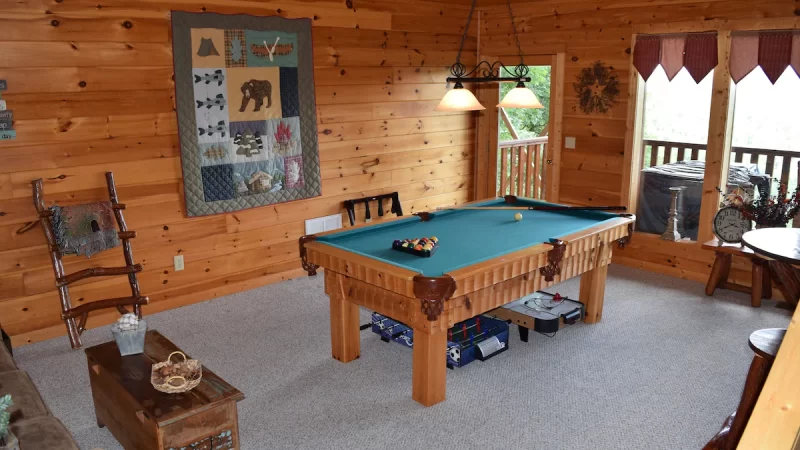 The cabin features a master suite, pool table, complete kitchen, Wi-Fi, and stunning Smoky mountain vistas from a private jacuzzi.