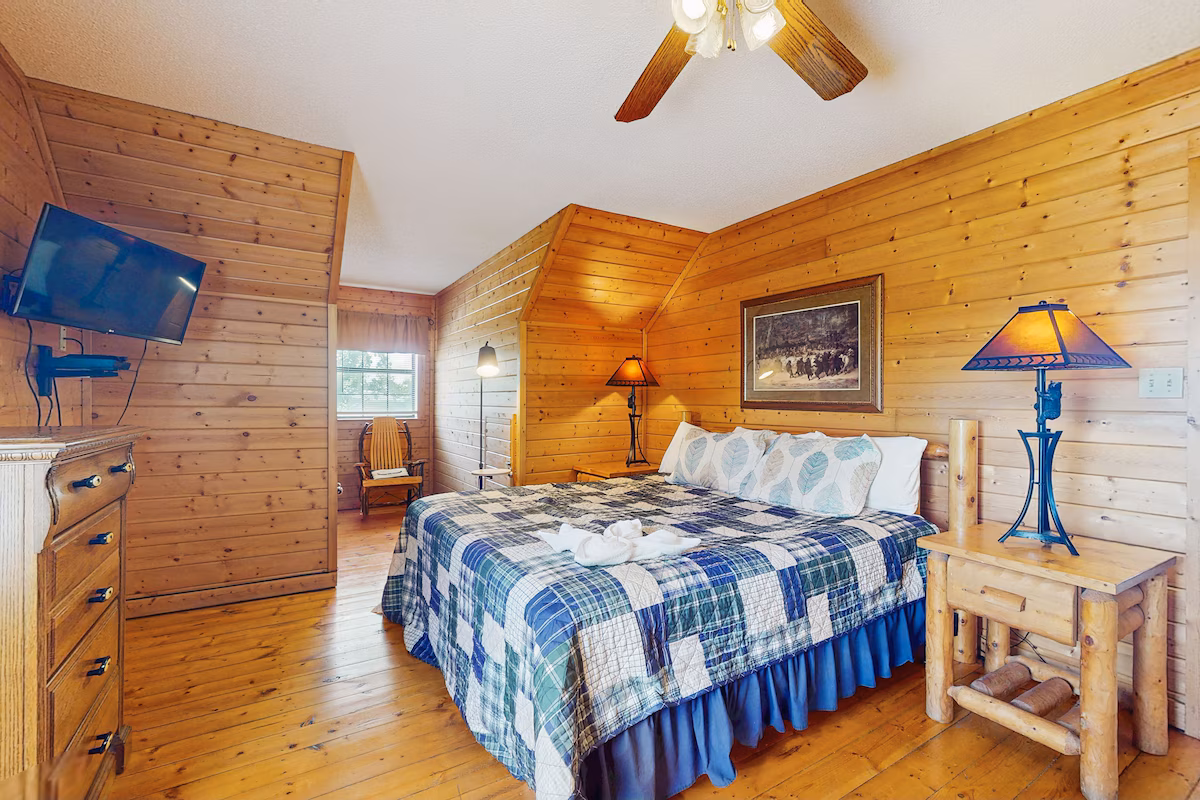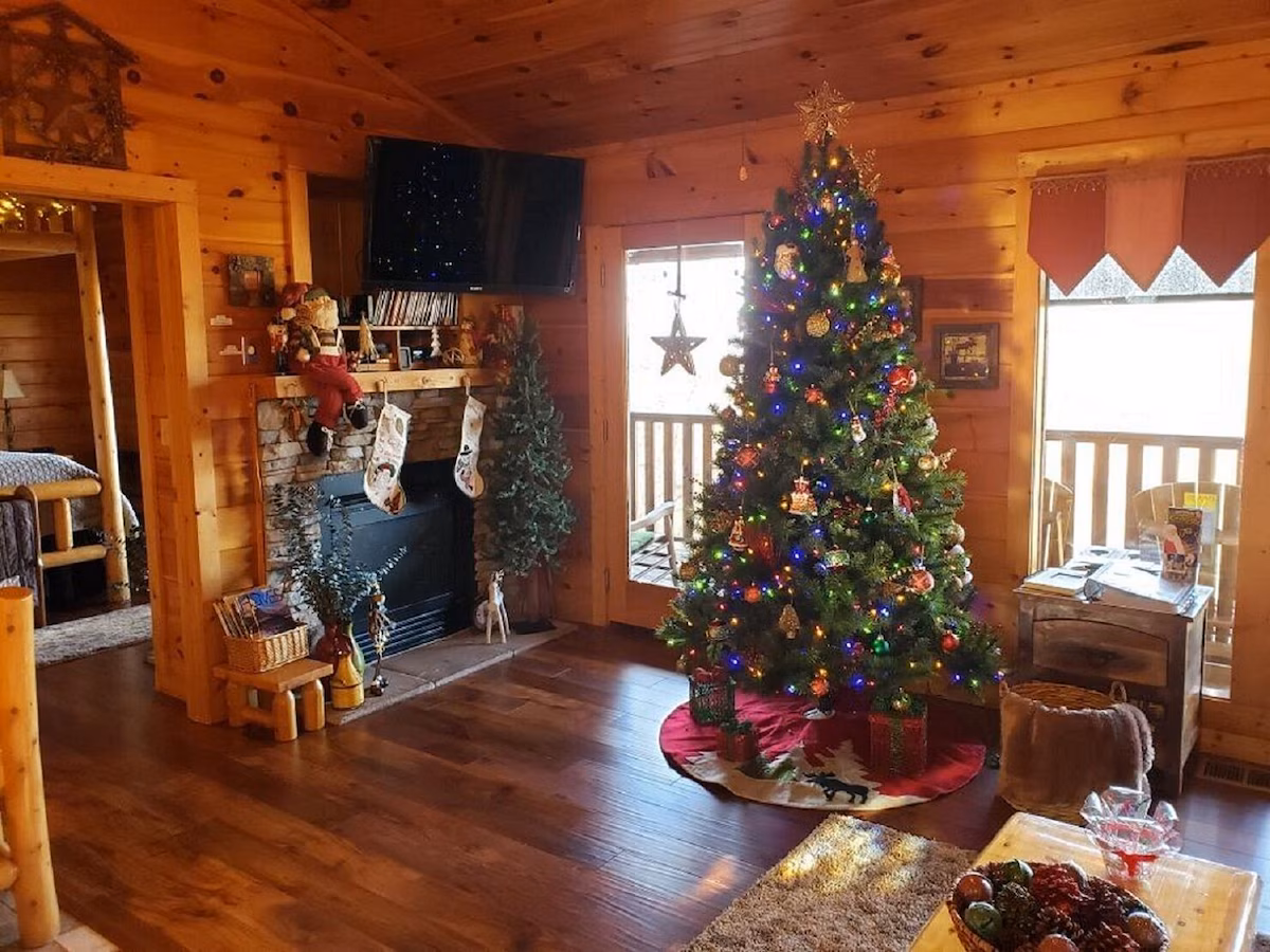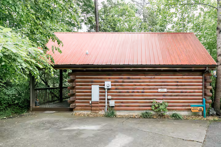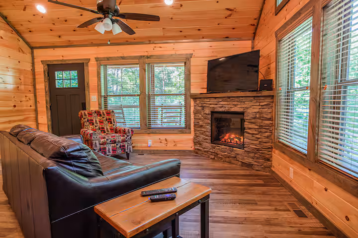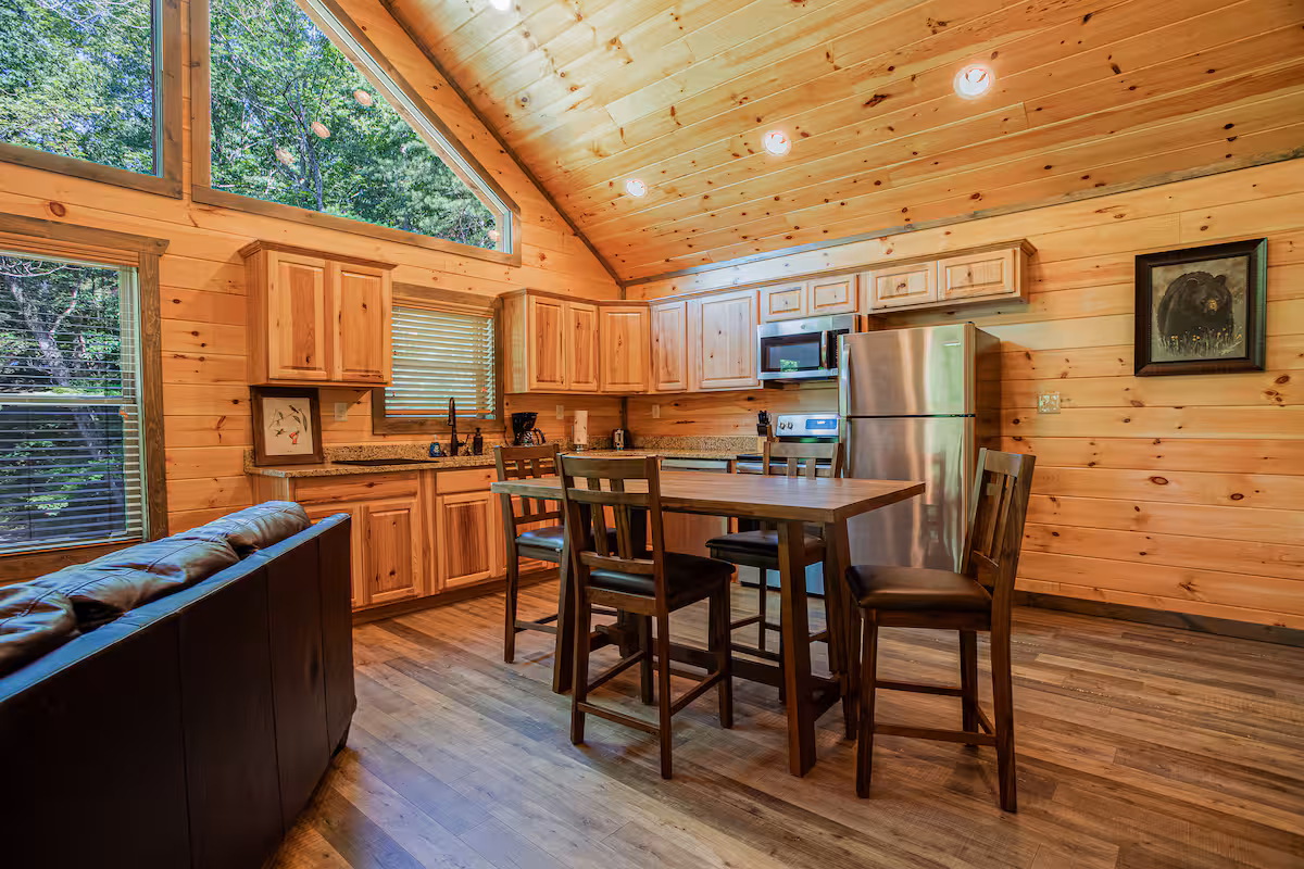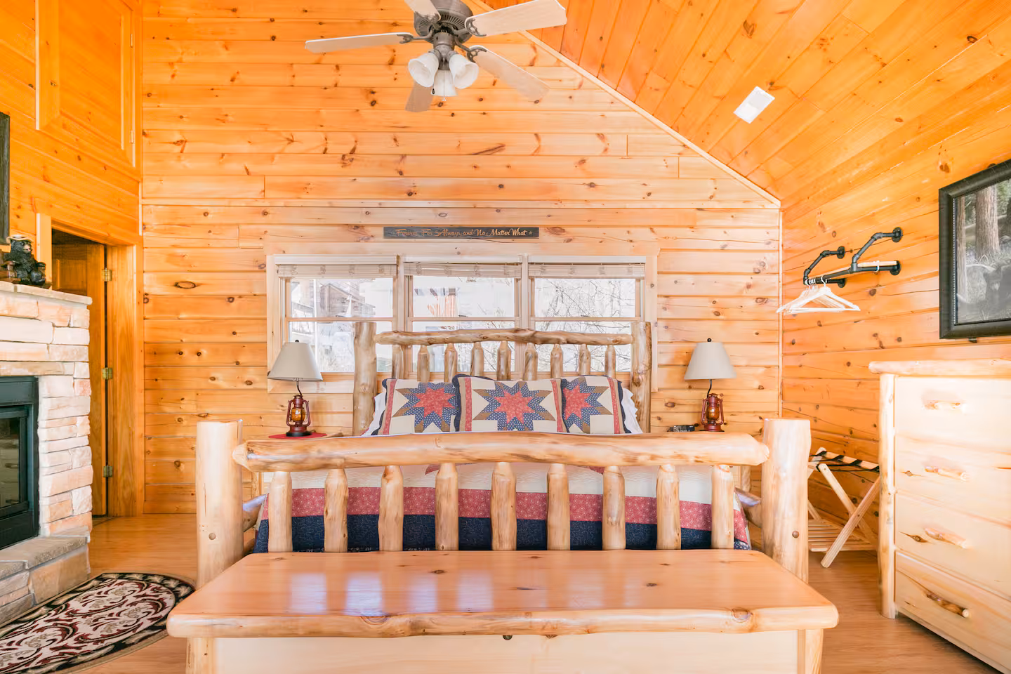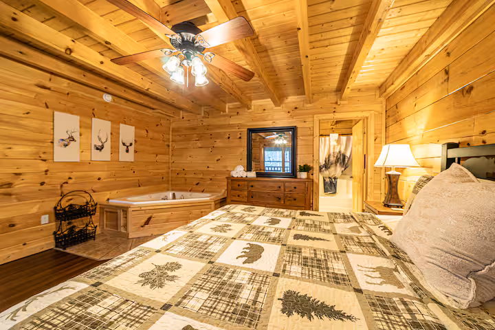 This studio cabin in Gatlinburg features a jetted tub and an outdoor jacuzzi, close to trails and shops.