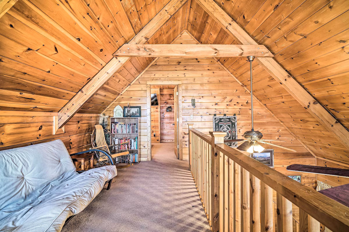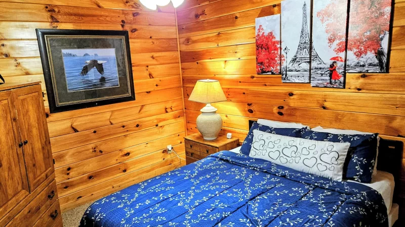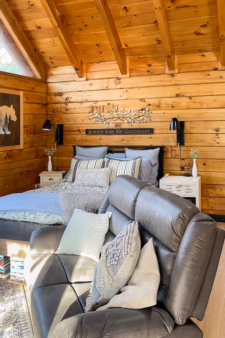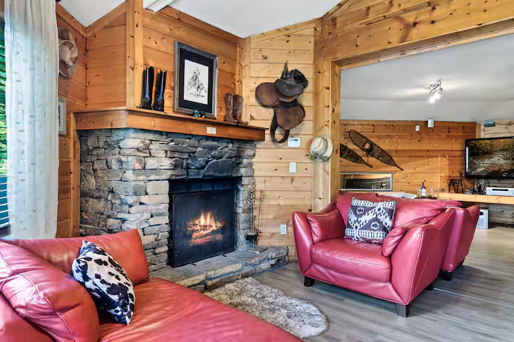 Queen bedroom with a sleeper sofa and jacuzzi ensures a warm, intimate experience. Enjoy WiFi, a kitchen, and a seasonal fireplace.