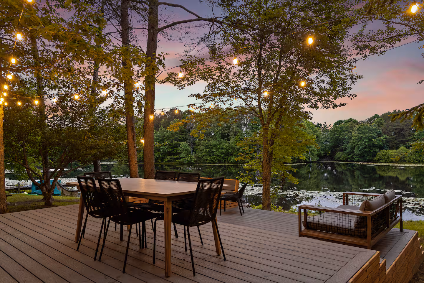 This exquisite lakeside cabin features indoor and outdoor spaces, a jacuzzi, fishing, lawn games, and a zip line.