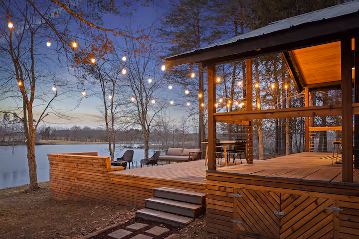 This luxury waterfront cabin, located between Nashville and Chattanooga, includes indoor and outdoor living areas, a hot tub, fishing, lawn games, and a zip line.