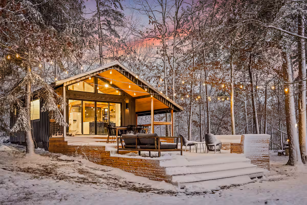 This contemporary Scandinavian retreat at 1360 ft. features a game room, fire pit, and a cozy jacuzzi.