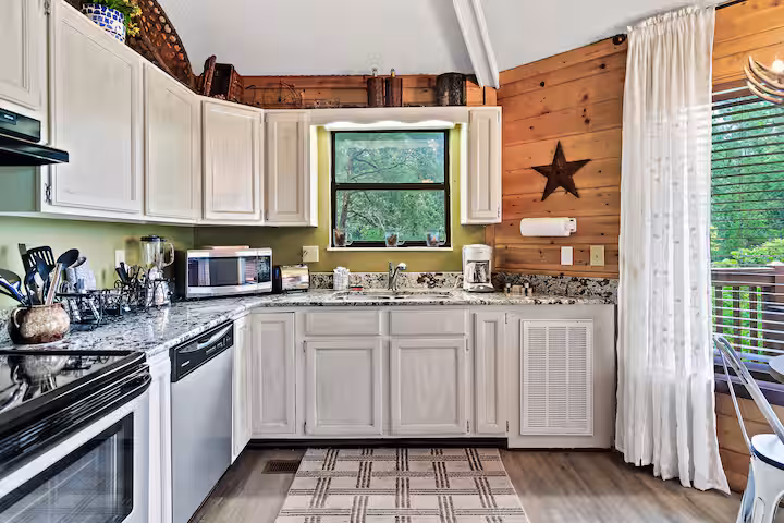 This 3-bedroom, 3-bathroom retreat features a private jacuzzi, spacious outdoors, and a complete kitchen.