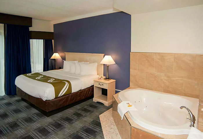 Alongside the in-room Jacuzzi, these hotels often provide a variety of luxurious amenities to elevate your experience. You can expect to find cozy beds, private bathrooms, free Wi-Fi, flat-screen TVs, mini-fridges, and in certain instances, fireplaces and balconies for that extra touch of comfort. It’s the perfect setting for relaxation and enjoying your getaway!