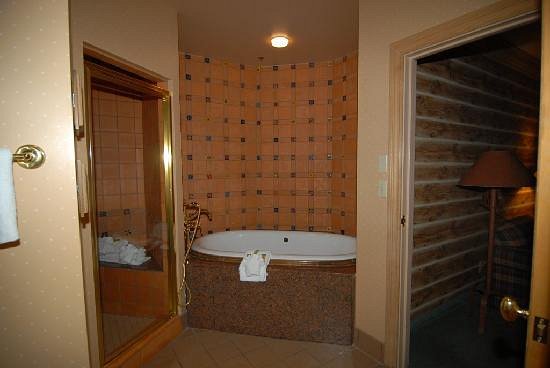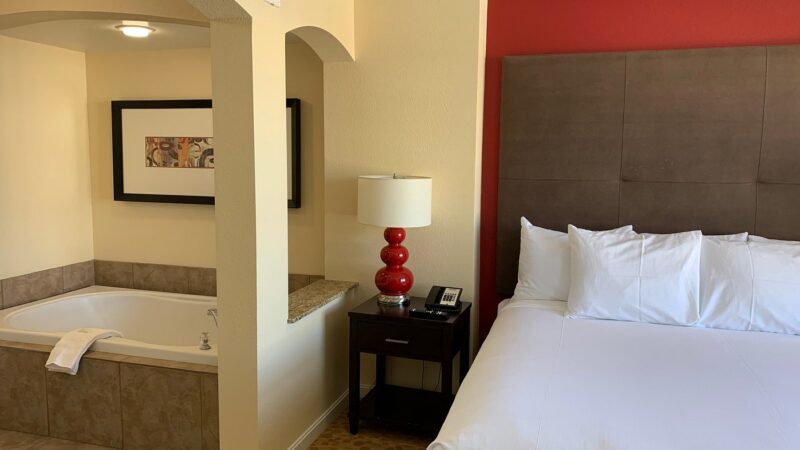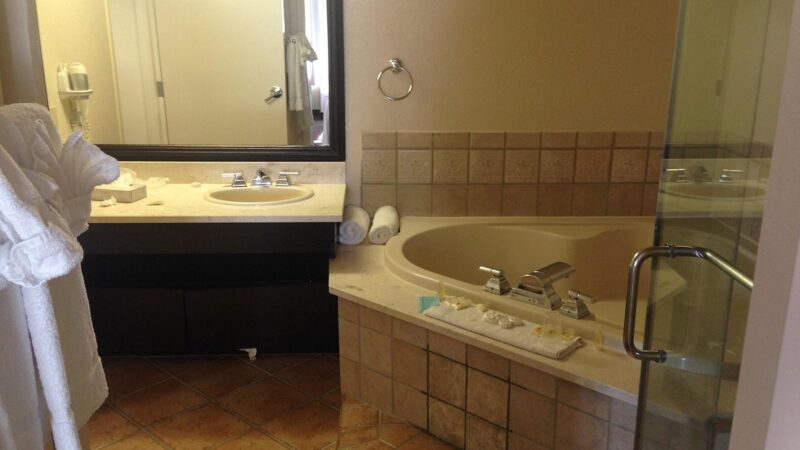 The hotel used to be condominiums before the 2008 crash, so each room (I think) has at least a stove, microwave, and small, but spacious fridge. The bathroom has a jacuzzi. Our own private jacuzzi!!