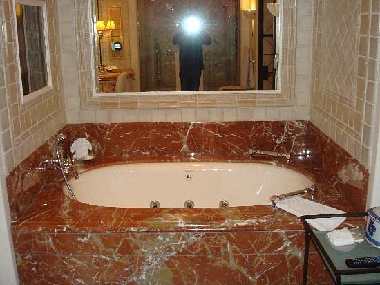 The hotel used to be condominiums before the 2008 crash, so each room (I think) has at least a stove, microwave, and small, but spacious fridge. The bathroom has a jacuzzi. Our own private jacuzzi!!