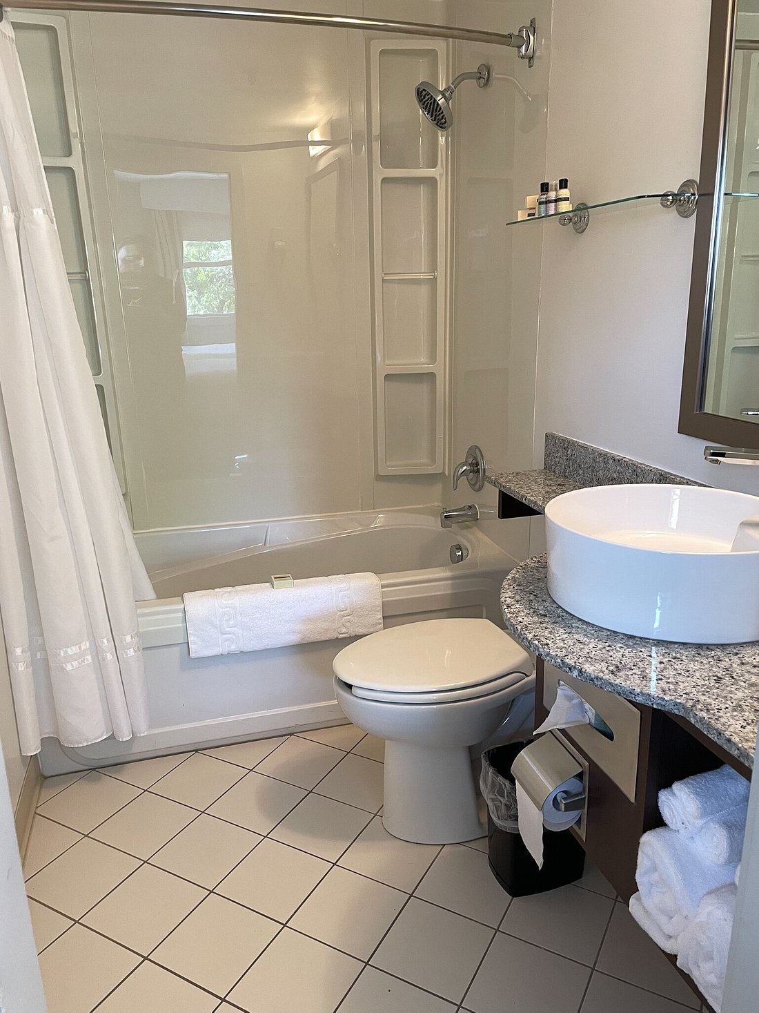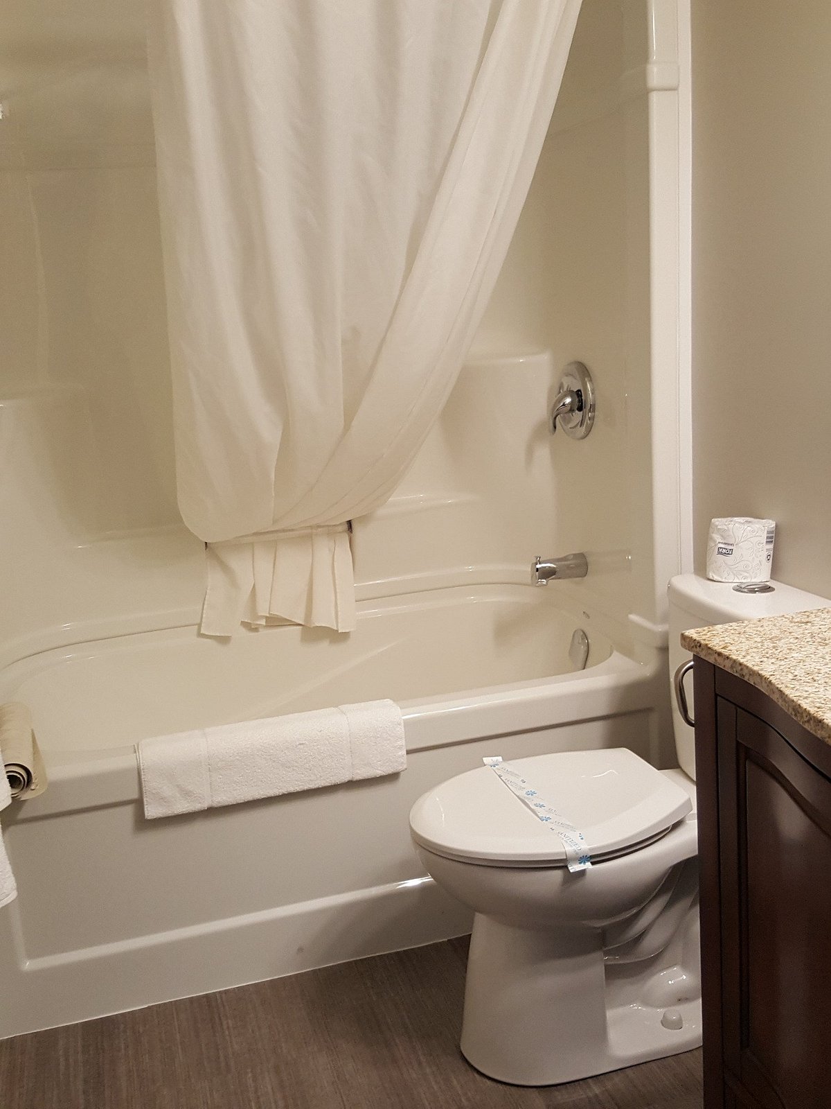 Check-in at the desk was made easier booking through Expedia. Clerk at the counter was very nice and friendly. Nice spacious room. Comes with a small fridge. AC unit doesn’t have a remote, which is fine. Washroom is clean but has no fan, so it fills with steam while showering. Wide counter, one sink. Shower is in a bathtub. We’re happy with the room, location, and service.
