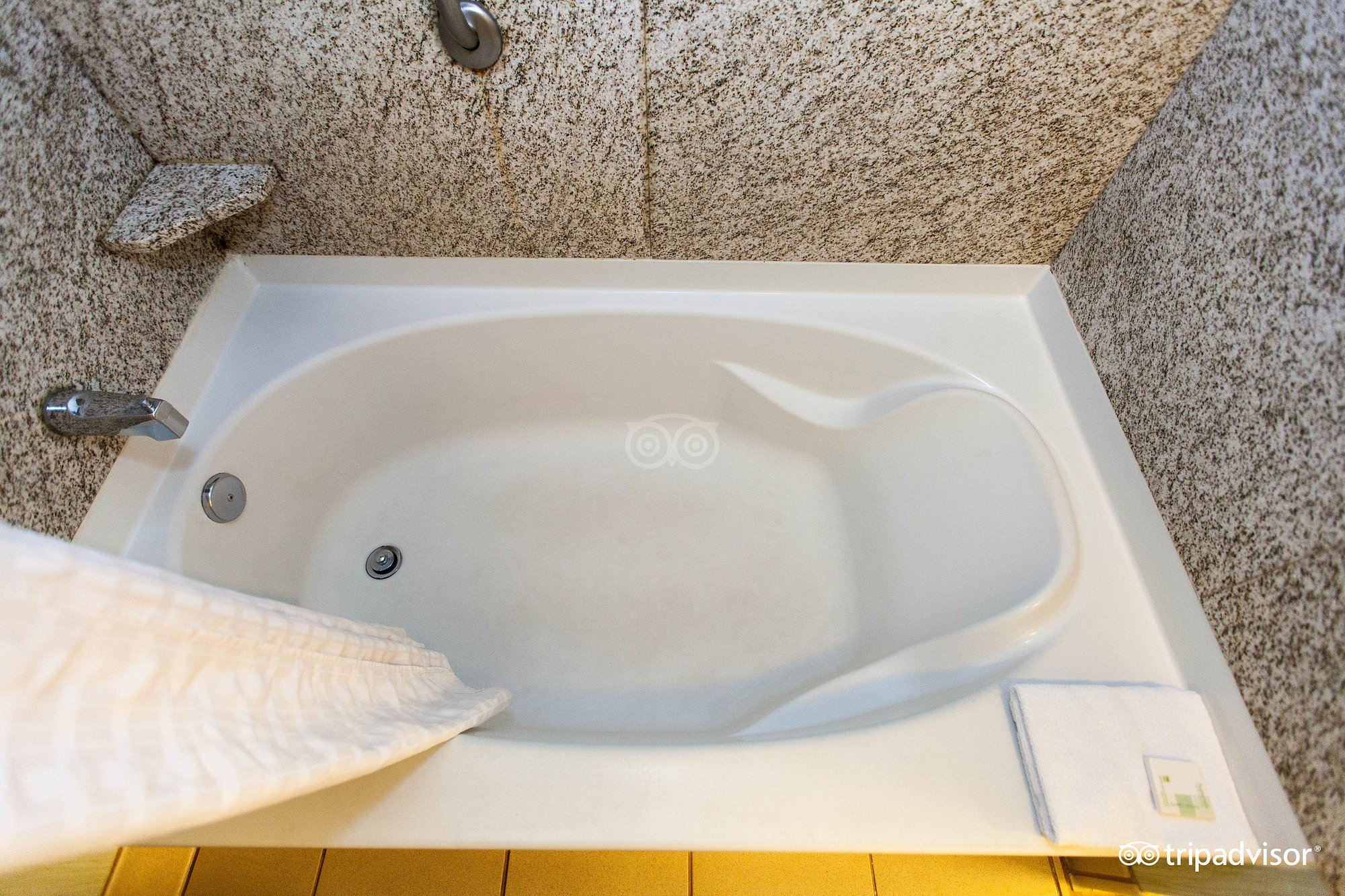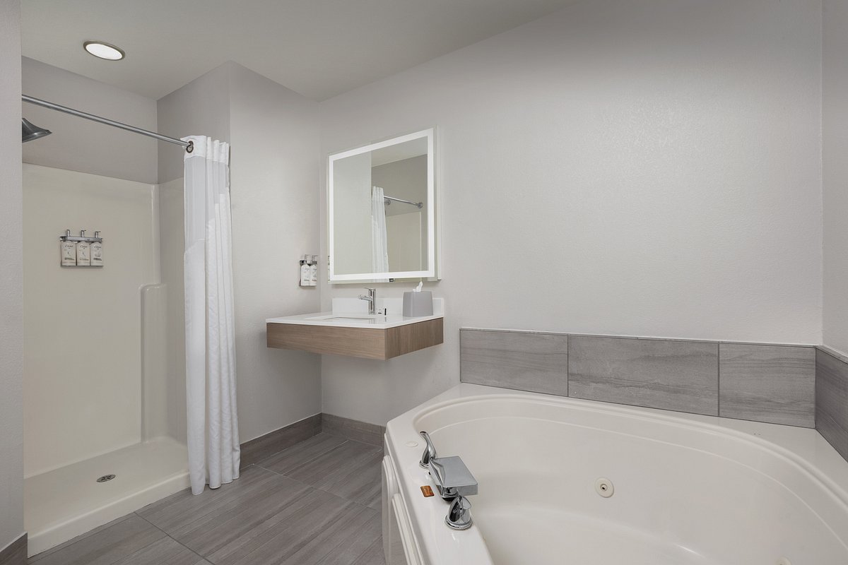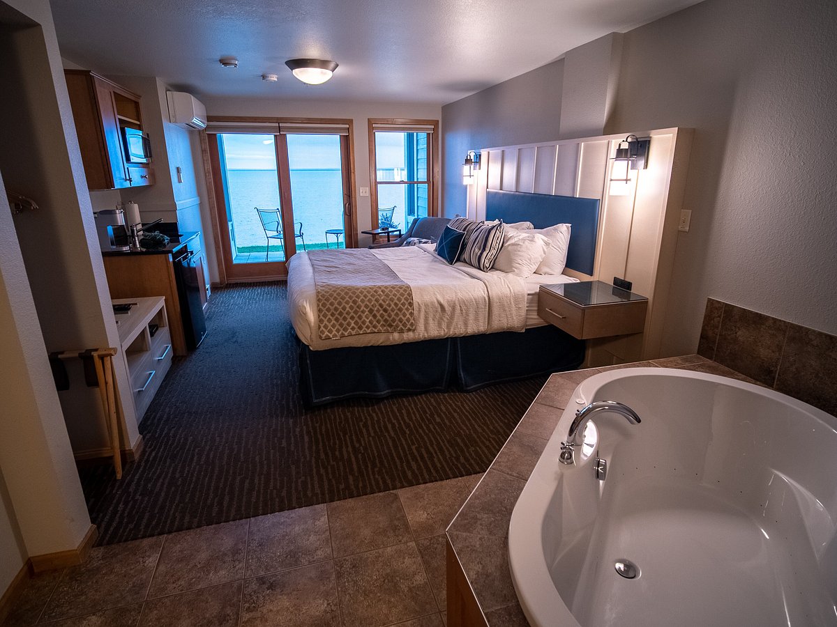 Stayed at Beacon Pointe for 2 nights. We had a suite, a king size bed, refrigerator, sink,nice balcony overlooking the lake. The shower in our room was wonderful! There was a jetted tub, but we didn’t use it. Service was fine. Grab-n-go breakfast was ok, with cereal, bagels, hard boiled eggs, yogurt, orange juice and coffee. Would definitely stay there again.
