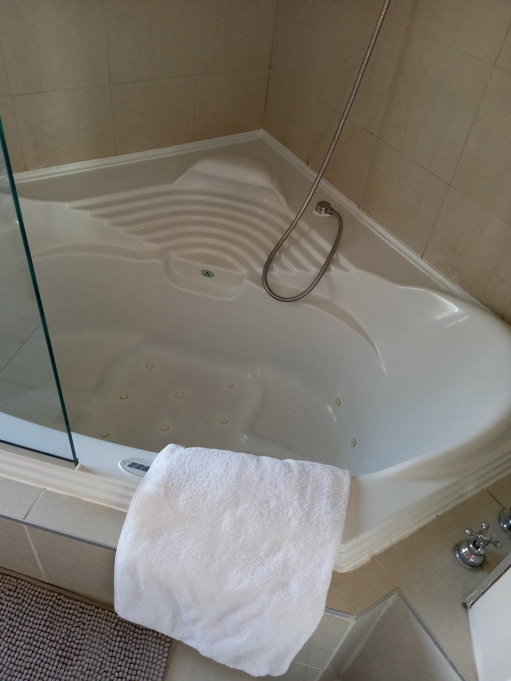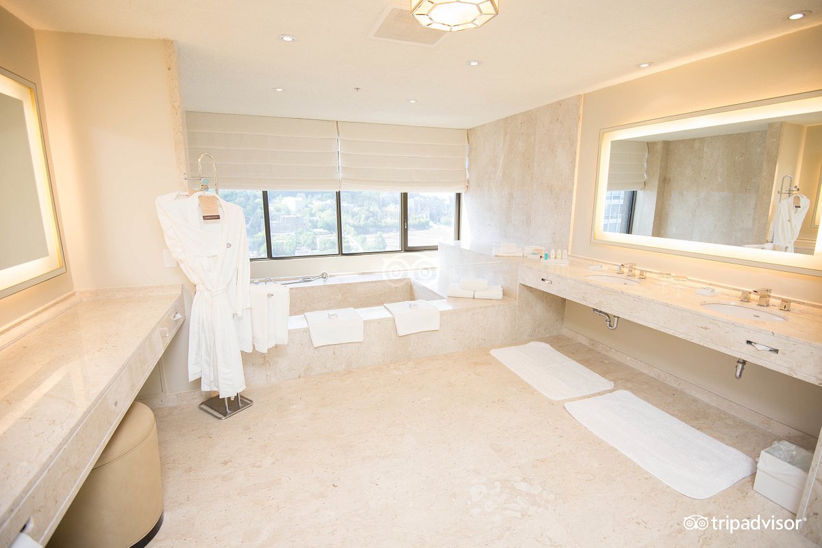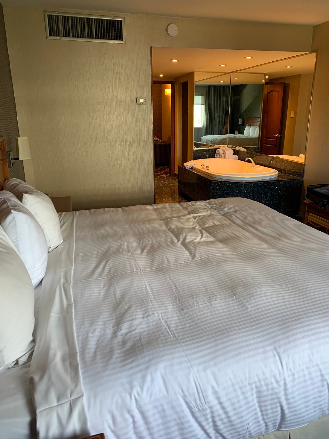 Had a king bed suite, my wife and I brought our 15 y/o granddaughter for nearby shopping…very convenient for that purpose. Master bedroom, living room with sleeper sofa, kitchen/dining area all very nice. Master bath had large jacuzzi but no shower. There was a hand held sprayer in the jacuzzi but it was difficult to get in jacuzzi and there was no shower curtain to contain the water spray. Bathroom in living room area had very small shower stall that we had to use. Would suggest getting rid of jacuzzi and installing a shower stall. Sleeper sofa was old and very uncomfortable for granddaughter sleeping. We can say that everything was spotlessly clean, and the valet and front desk personnel were extremely helpful and friendly. Would stay here again, but in a different room.