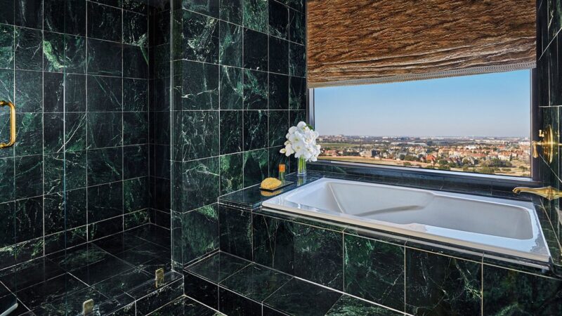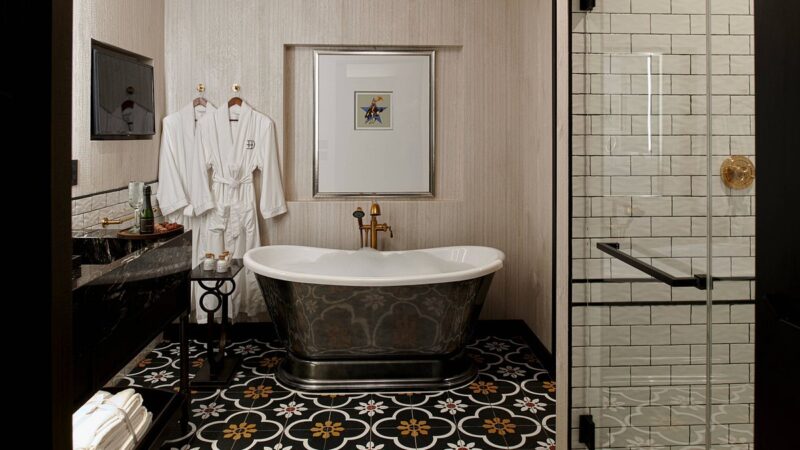 Sophisticated hotel with private spa tubs, infinity pool, and a Texas-shaped rooftop lazy river in downtown Houston.