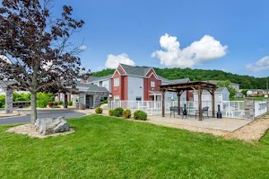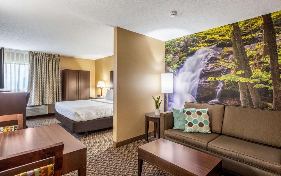 Hotel near I-81 features soothing private hot tubs, a cozy lobby fireplace, and complimentary waffles.
