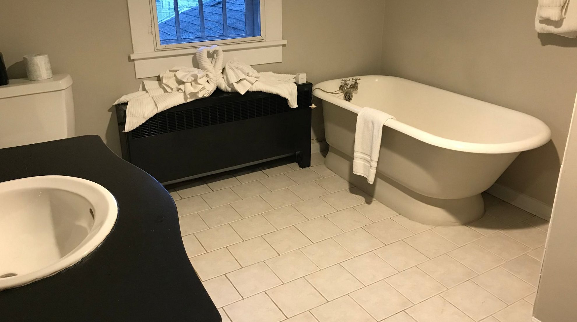 The room is large and well-appointed. The bathroom is very large. Everything appears clean. The only negatives are (1) the wall thermostat does not work – the controls are on the A/C unit, and the cover is broken; (2) the closet door is missing – I might not have noticed, but the hinges and latch are still there, and there is an outline of dirt where the door used to be; and (3) the bathtub shelf was broken off. Really, it was a good room. The toilet didn’t run, the heat wasn’t noisy, and the room was quiet. The lobby was nice, with a double-sided fireplace. Kind of cozy.