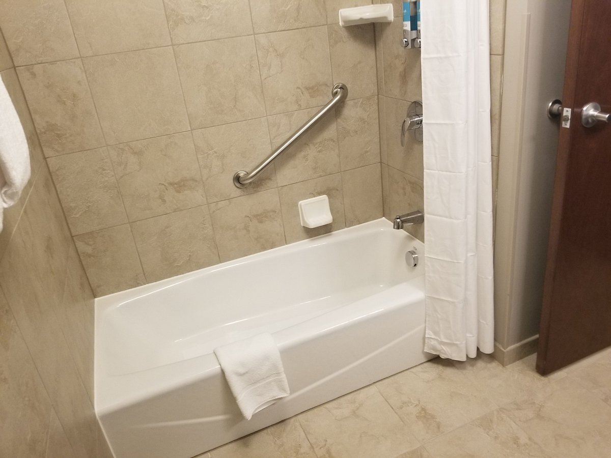 Our room was very large! Sink, counter, cabinets, 2 burner stovetop, a fridge much bigger than most — maybe 4.5 feet tall with separate freezer & fridge as you walk in. Two sinks in the bathroom, 2 queen beds, and a sofa bed. The sofa was “L” shaped and was more comfortable than the pull out sofa bed. My daughter slept on the long part of the sofa rather than the sofa bed. There was also a table with 2 chairs, a desk with a phone & notepad & pen, a nice desk chair and plenty of places to plug in devices to charge. The room also had a closet with a suitcase holder & ironing board & hangers and also a padded bench to sit on. We had room 402 and it has a huge space in it — probably 20′ × 8′ of free space – from foot of beds to desk one direction (8ish ft) and from counter & fridge by door to back wall by a/c & window (20′? 24′?). Wonderful!!! We enjoyed the breakfast as well: scrambled eggs, bacon, instant oatmeal packets, cereal, bagels, muffins, breads, waffles you can make, juices, coffee, milk, etc. Comfy beds, too!!