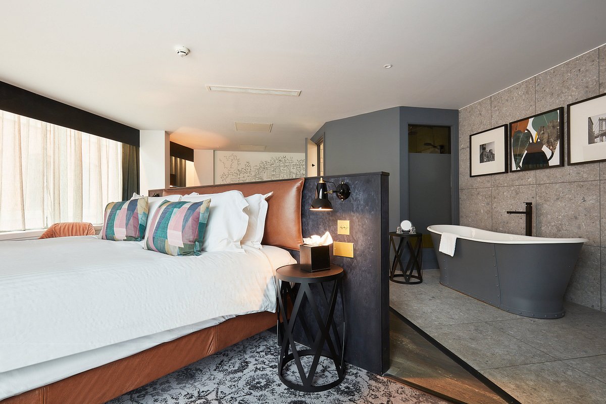 The boutique hotel offers luxurious marble bathrooms with jacuzzi, cozy bedding, and a vibrant bar in Manchester.