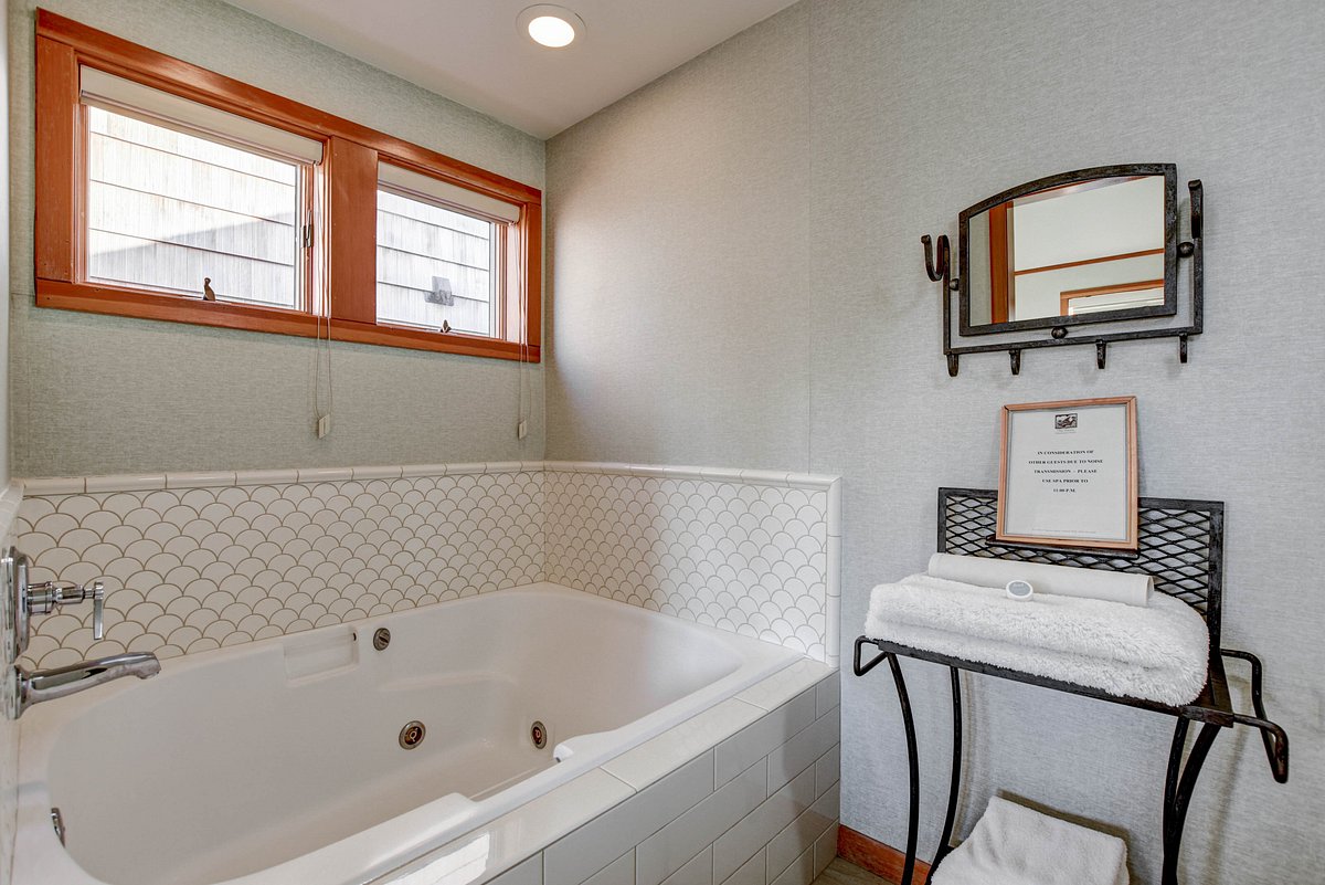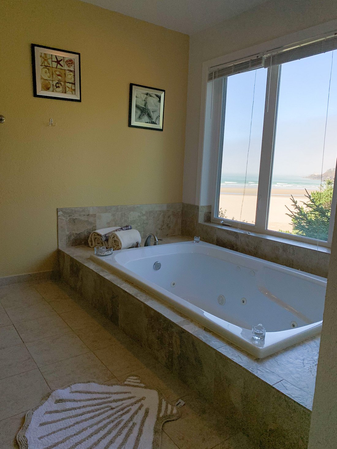 We did a couples getaway in April, just before the busy warm & sunny season, and were able to have our dog stay with us! The management were super helpful and friendly, met the friendly owner who happened to be visiting that month, and had a wonderful weeklong stay with views we will never forget. We actually enjoyed the storms, and spent the non-stormy days visiting some familiar places around Newport. The bed upstairs is incredibly comfortable (medium-firm & supportive), and the jacuzzi tub is SO roomy for 2 adults. If we could have stayed another week, we would have, but I’ll just have to make it an annual stay now