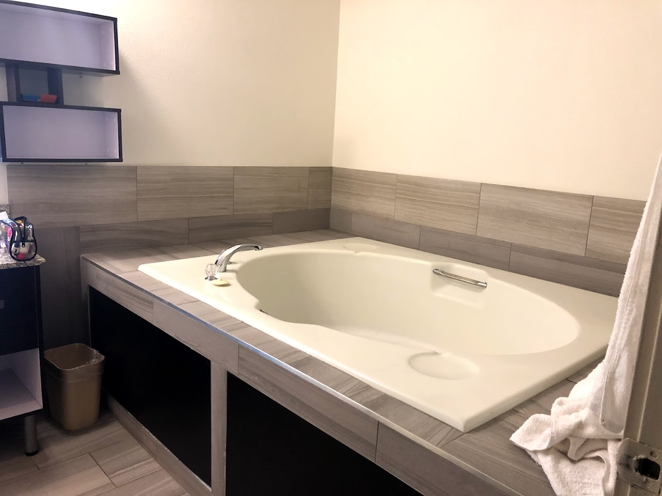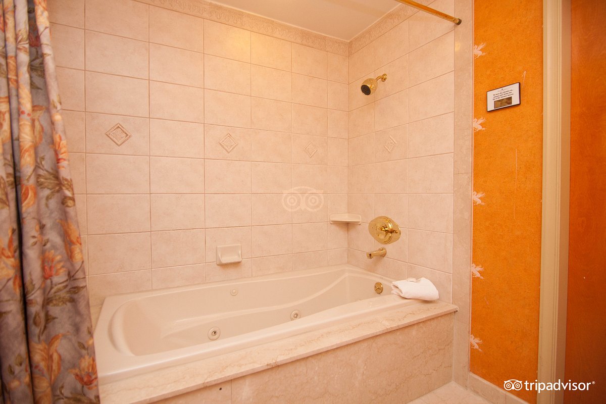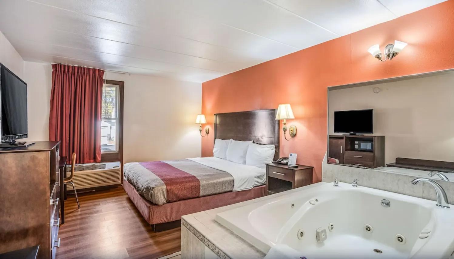 A budget-friendly hotel features a hot tub in one of its rooms, near the highway and Sesame Place.