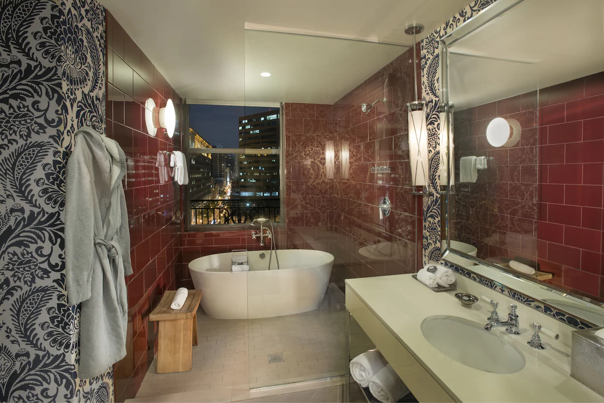 Several suites at The Logan feature an in-room jacuzzi, offering skyline views and contemporary Philly art.