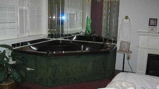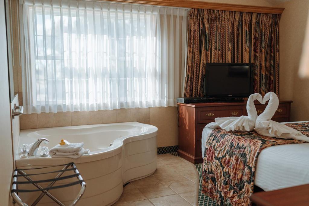 Escape to a cozy room featuring a romantic hot tub, TVs, and complimentary breakfast by Lakeview Amphitheater.